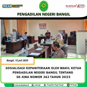 Panitera, Panitera Muda dan seluruh Panitera Penggantin serta Jurusita Pengadilan Negeri Bangil mengikuti Sosialisasi SK-KMA Nomor 363 Tahun 2022 tentang Petunjuk Teknis Administrasi Dan Persidangan Perkara Perdata, Perdata Agama, Dan Tata Usaha Negara Di Pengadilan Secara Elektronik yang dilaksanakan oleh Wakil Ketua Pengadilan Negeri Bangil Bpk. Dr. Salomo Ginting, SH., MH