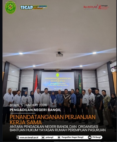 Telah dilaksanakan penandatanganan Perjanjian Kerja Sama antara Pengadilan Negeri Bangil dan Organisasi Bantuan Hukum Yayasan Rumah Perempuan Pasuruan. Kerja sama ini menjadi wujud komitmen bersama dalam memperkuat sinergi dan meningkatkan pelayanan hukum bagi masyarakat.