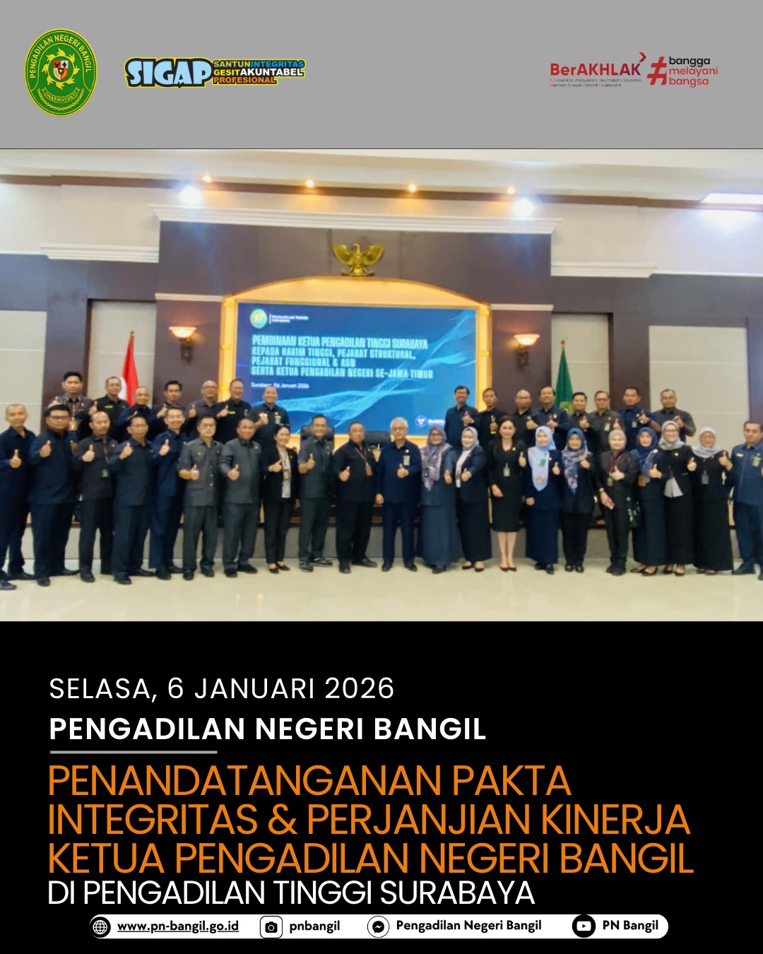 Ketua Pengadilan Negeri Bangil Ibu Wahyu Iswari, S.H., M.Kn. melaksanakan kegiatan Penandatanganan Pakta Integritas & Perjanjian Kinerja Tahun 2025 yang disaksikan oleh Ketua dan Wakil Ketua Pengadilan Tinggi Surabaya. Kegiatan ini dihadiri oleh 35 (Tiga puluh lima) Ketua Pengadilan Negeri se-Jawa Timur.