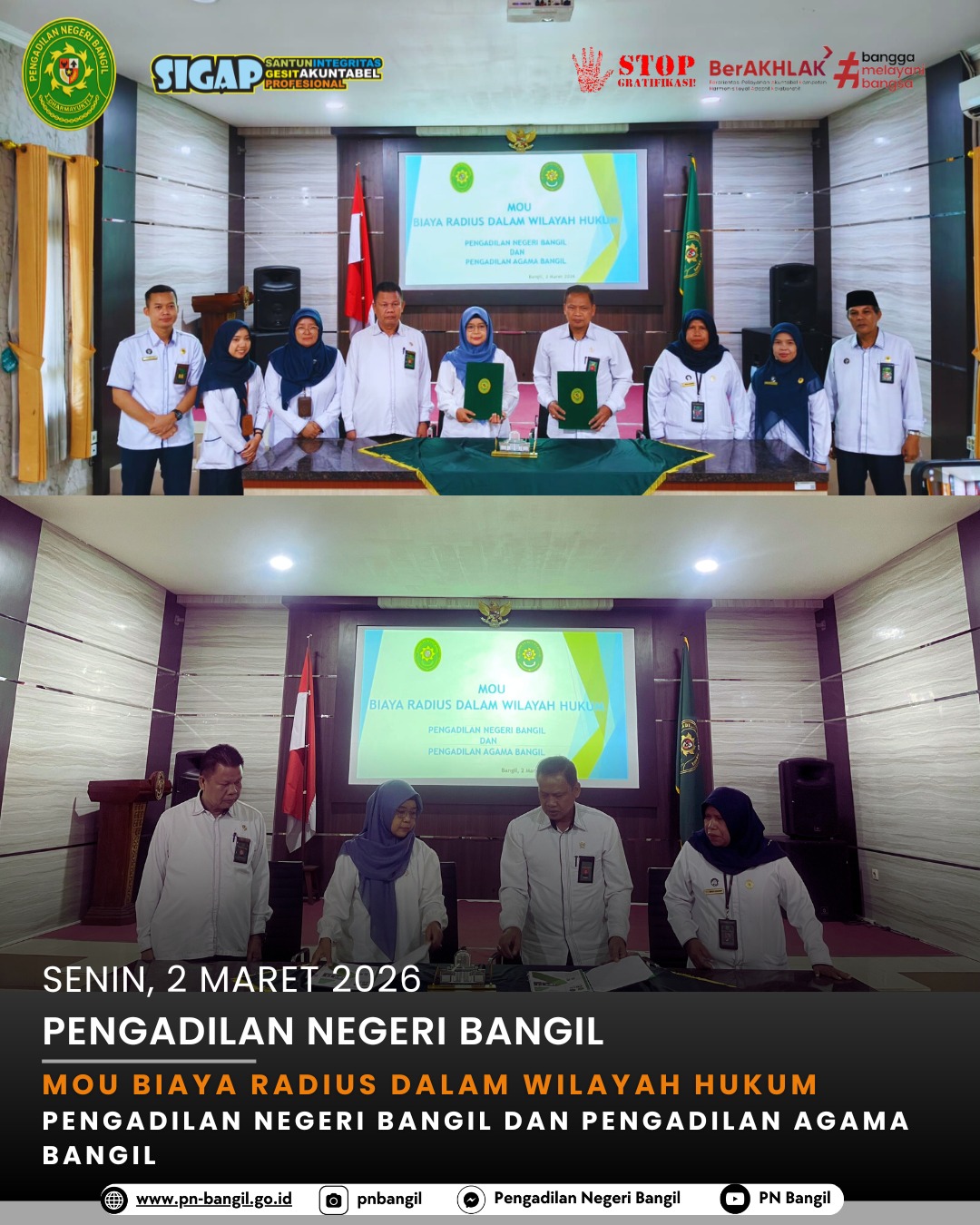 Pengadilan Negeri Bangil bersama Pengadilan Agama Bangil melaksanakan penandatanganan Nota Kesepahaman (MoU) tentang Biaya Radius dalam Wilayah Hukum Kabupaten Pasuruan yang bertempat di Aula Dr. H. Herri Swantoro, S.H., M.H. Pengadilan Negeri Bangil.