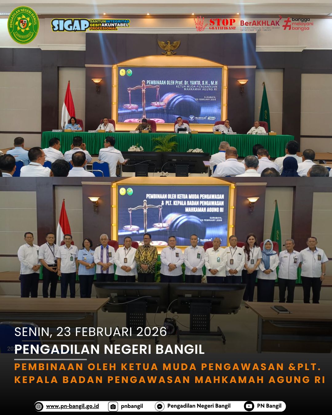 Pengadilan Negeri Bangil menghadiri kegiatan pembinaan yang disampaikan oleh Prof. Dr. Yanto, S.H., M.H. selaku Ketua Muda Pengawasan Mahkamah Agung Republik Indonesia, sebagai upaya penguatan integritas dan peningkatan kinerja aparatur peradilan. Kegiatan ini dihadiri oleh Ketua Pengadilan Negeri Bangil, para Hakim, Panitera, dan Sekretaris sebagai bentuk komitmen bersama dalam menjaga profesionalisme, akuntabilitas, serta memberikan pelayanan hukum yang transparan dan berkeadilan kepada masyarakat.