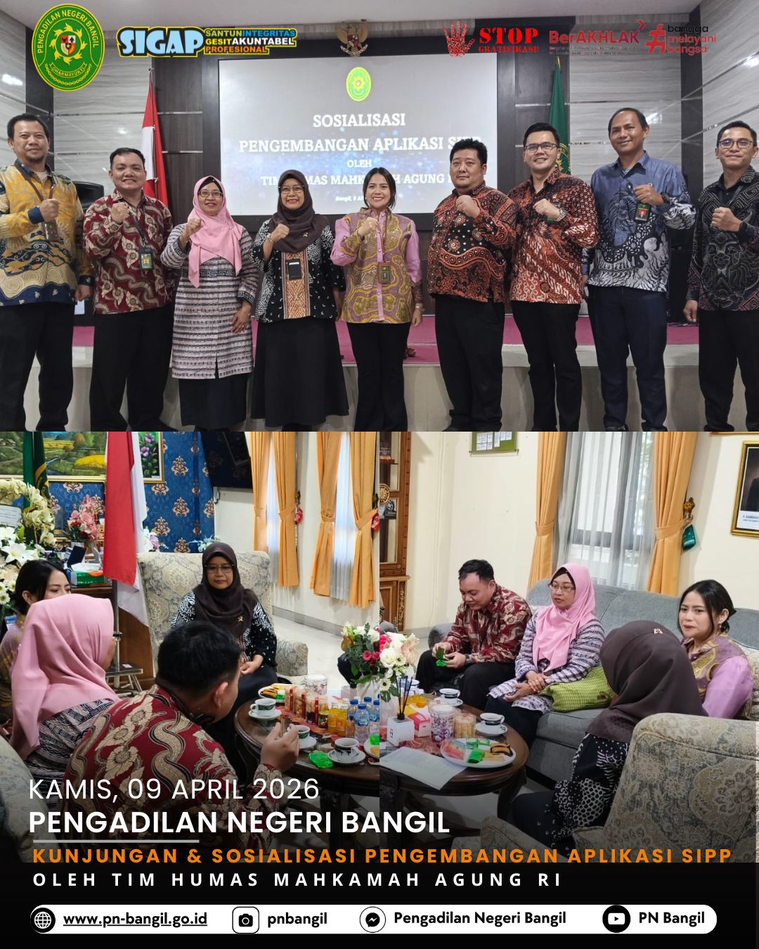 Pengadilan Negeri Bangil menerima kunjungan sekaligus melaksanakan kegiatan sosialisasi pengembangan Aplikasi SIPP oleh Tim Humas Mahkamah Agung RI sebagai upaya peningkatan kualitas layanan peradilan berbasis teknologi. Kegiatan ini menjadi sarana berbagi pengetahuan, penguatan pemahaman, serta penyempurnaan implementasi sistem informasi penelusuran perkara guna mendukung transparansi, akuntabilitas, dan efisiensi kinerja. Dengan adanya sosialisasi ini, diharapkan seluruh aparatur semakin optimal dalam memanfaatkan aplikasi SIPP demi memberikan pelayanan yang cepat, tepat, dan profesional kepada masyarakat.