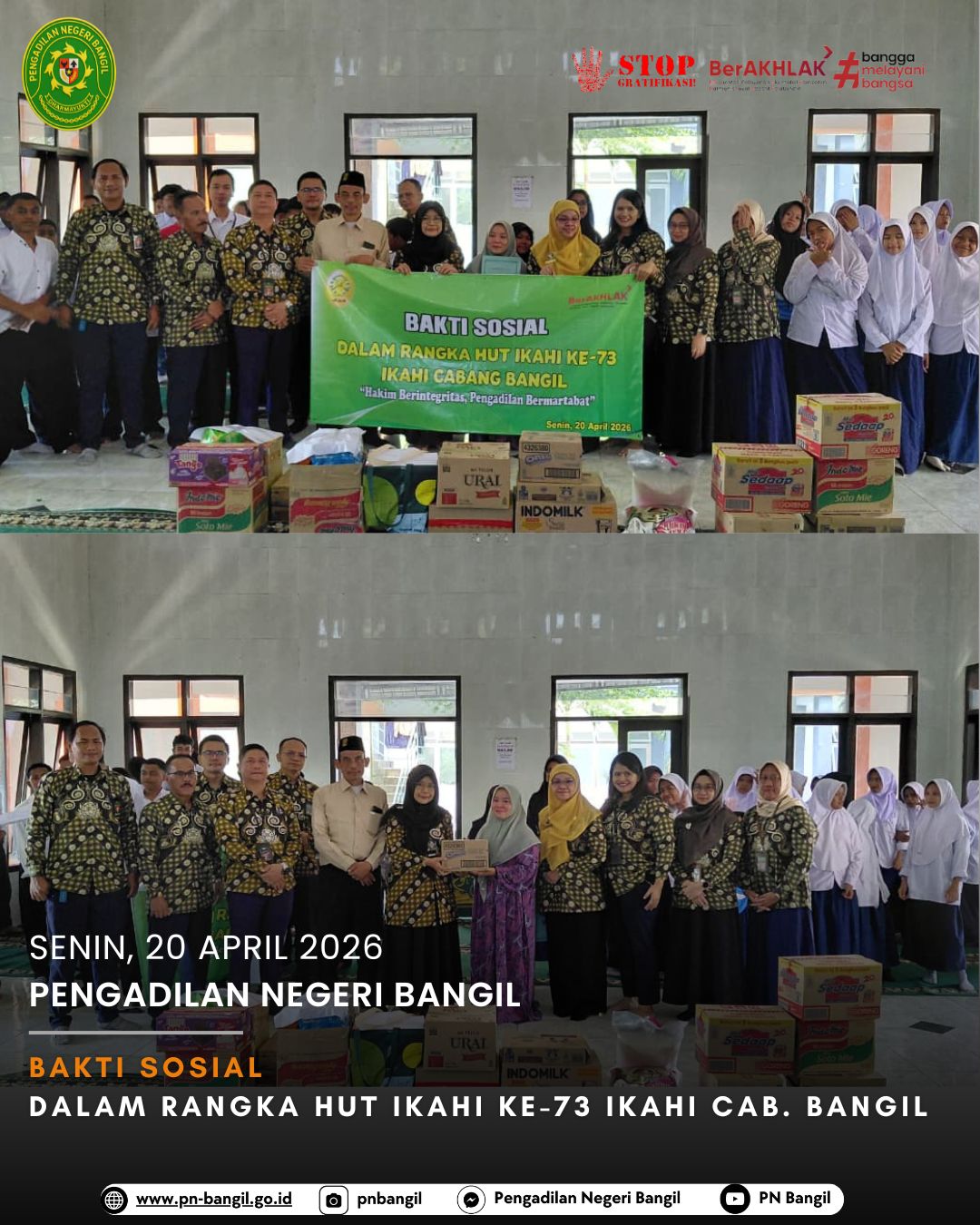 Dalam Rangka Memperingati HUT IKAHI ke 73, Pengurus Cabang Pengadilan Negeri Bangil melaksanakan kegiatan Bakti Sosial sebagai wujud syukur dan kepedulian nyata terhadap sesama,semoga bantuan yang disalurkan dapat memberi manfaat serta mempererat tali persaudaraan antara keluarga besar peradilan dan masyarakat.